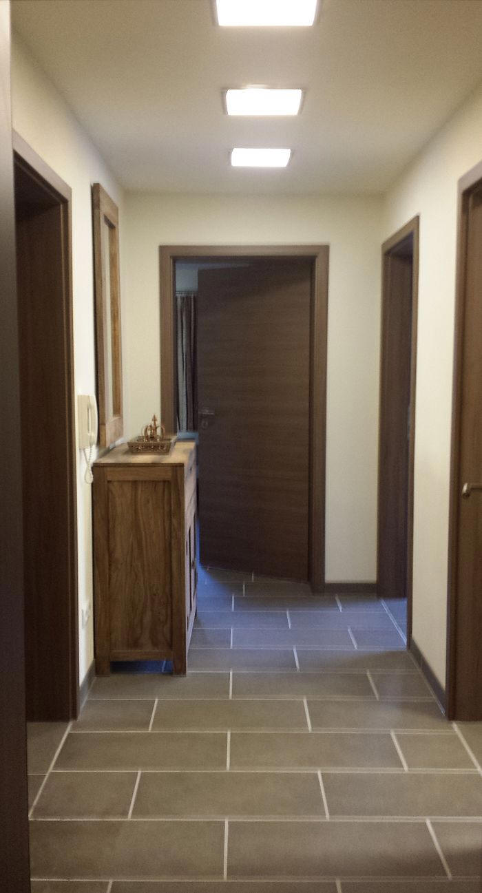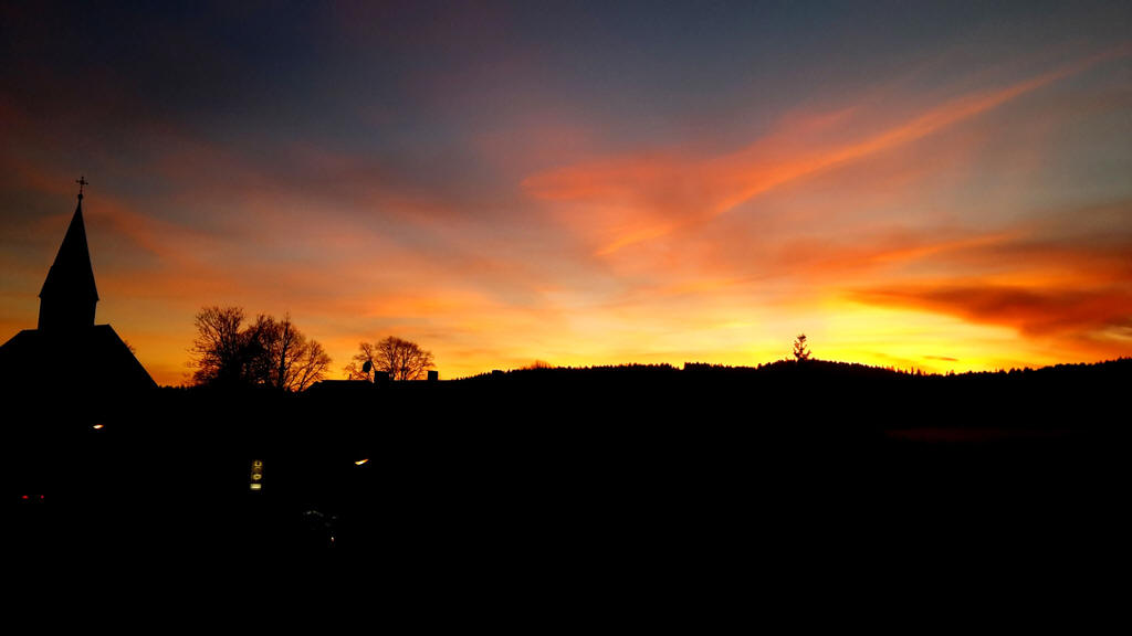Abendstimmung: Blick vom Hauseingang auf die Dorfkirche